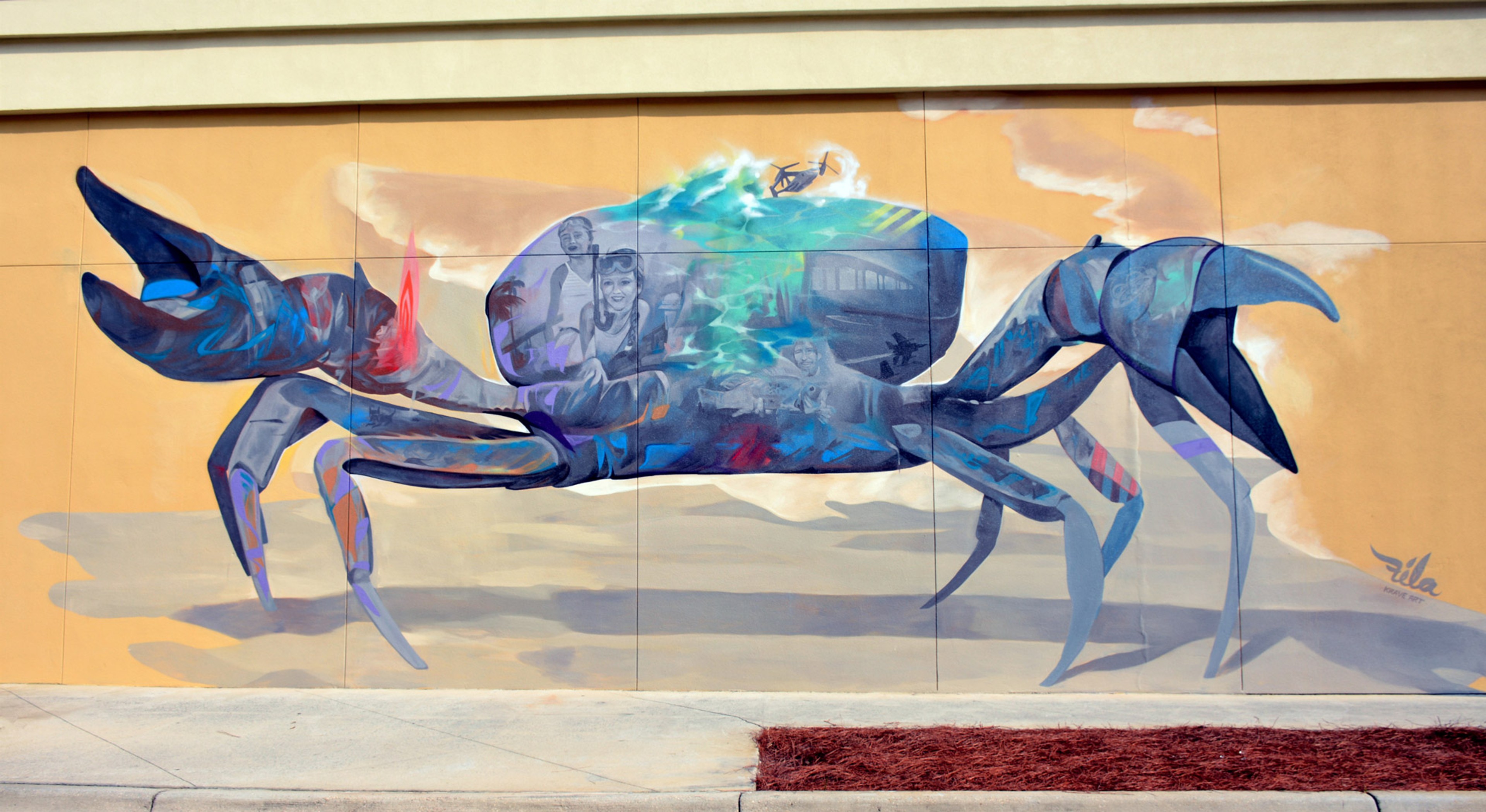 Daniel Fila, also known as Krave, is a multi-faceted artist whose work ranges from mural installations to figurative and abstract paintings, animations, and urban sculpture using a range of mediums, techniques, and aesthetics. Born in Miami, Fila was influenced by his father, a commercial artist, and began sketching as a young boy in order to express himself and distinguish his unique identity. His mural at Destin Commons depicts an oversized crab within which a complicated story unfolds.