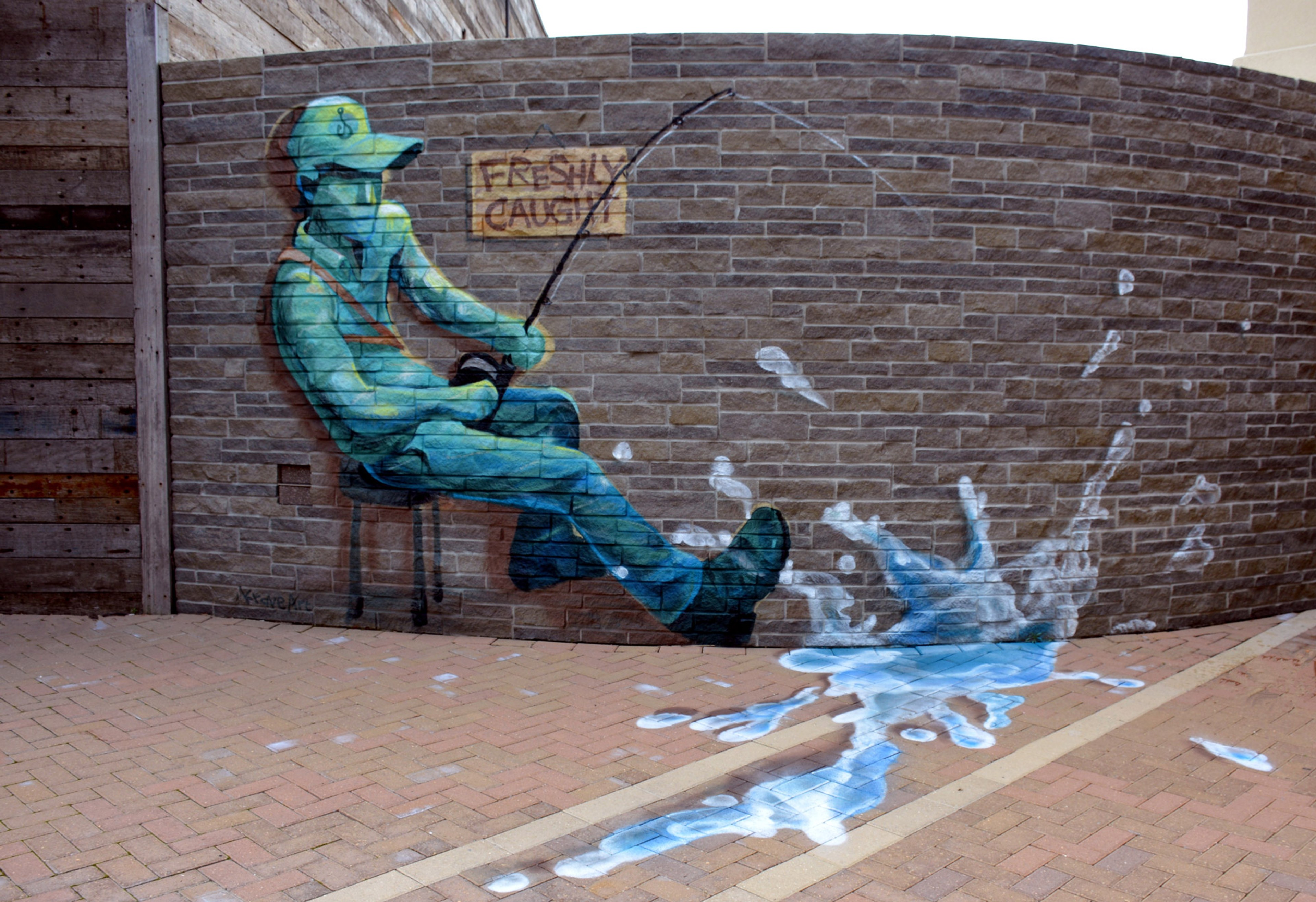 Daniel Fila, also known as Krave, is a multi-faceted artist whose work ranges from mural installations to figurative and abstract paintings, animations, and urban sculpture using a range of mediums, techniques, and aesthetics. Freshly Caught is one of two murals by Fila located at Destin Commons. Out of the bricks of the wall on which it is created, a fisherman makes a splash as he reels in a catch.