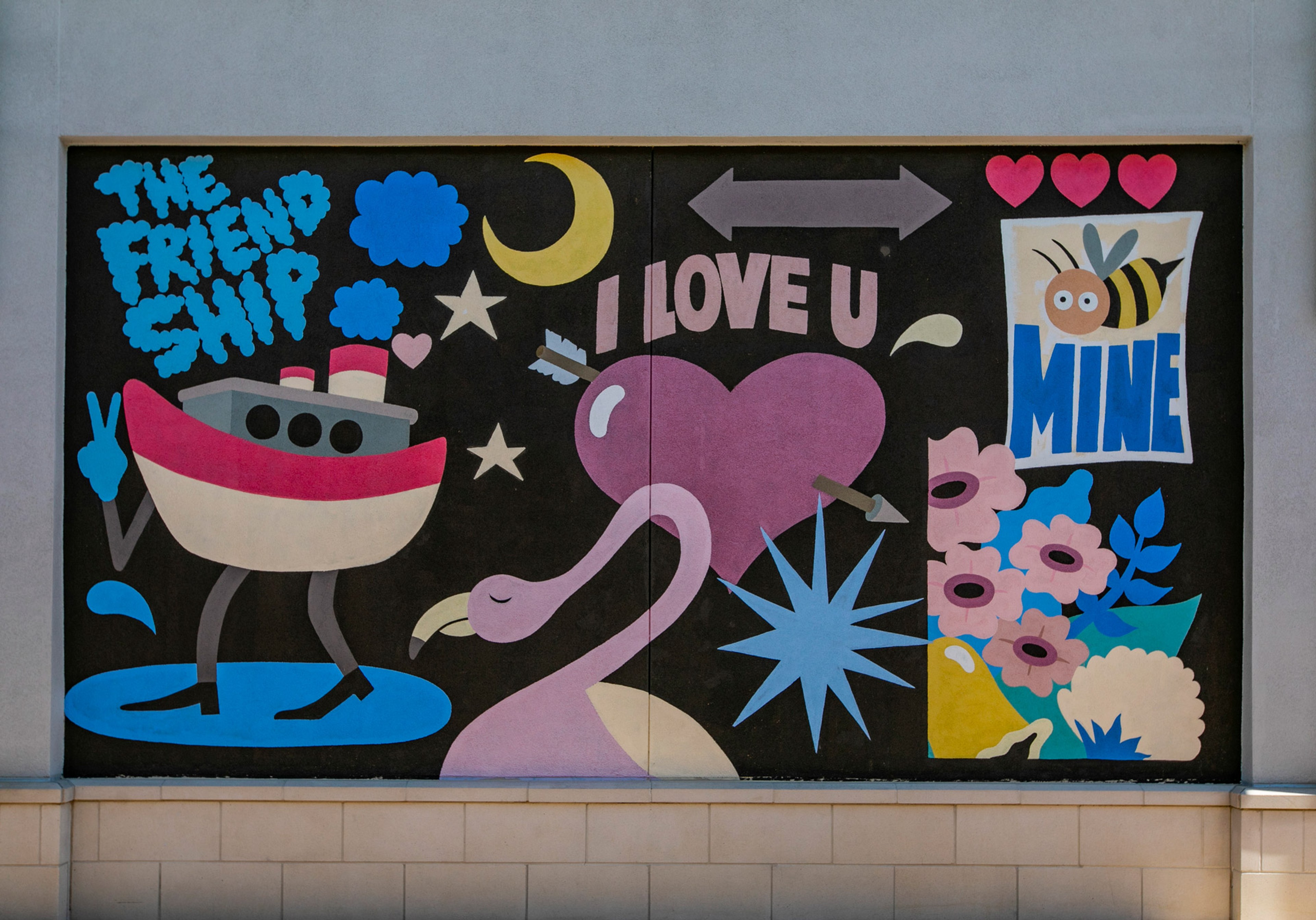 There is nothing random or erroneous in DABSMYLA’s work. It’s planned and executed – showing both whimsy and warmth. For Destin Commons, the Australian husband-and-wife visual artists created Friendship, I Love You. It is one of four murals by the duo at Destin Commons.