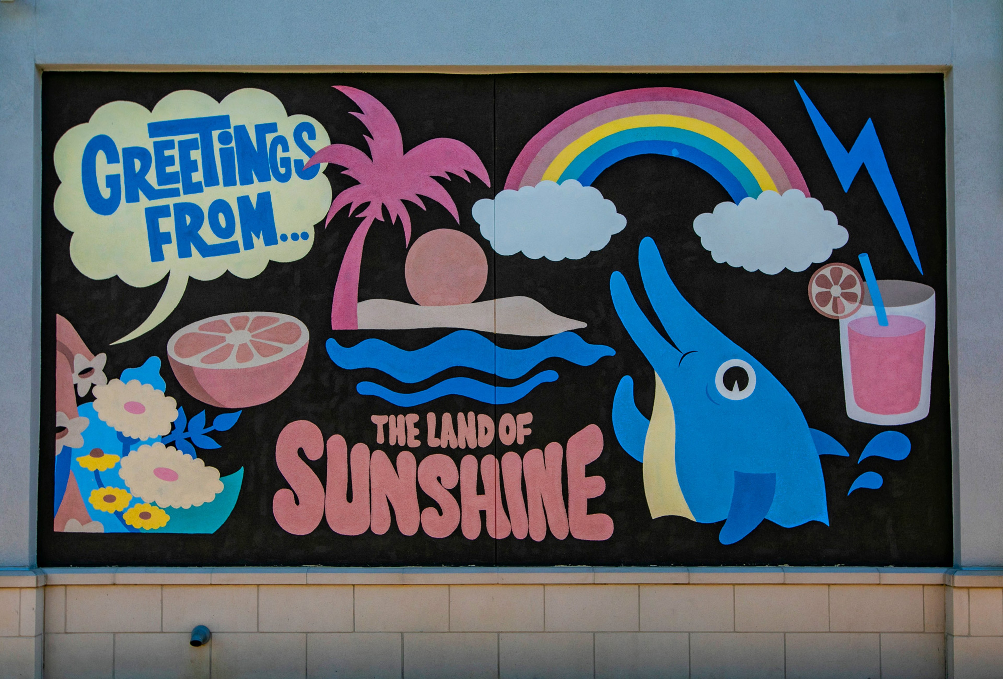Created by Australian husband-and-wife visual artists, DABSMYLA, Greetings From… The Land of Sunshine is a work that evokes the visuals often associated with Florida. The whimsical mural created especially for the property depicts oranges, dolphins, sunshine, and beaches. It is a love letter to the state.