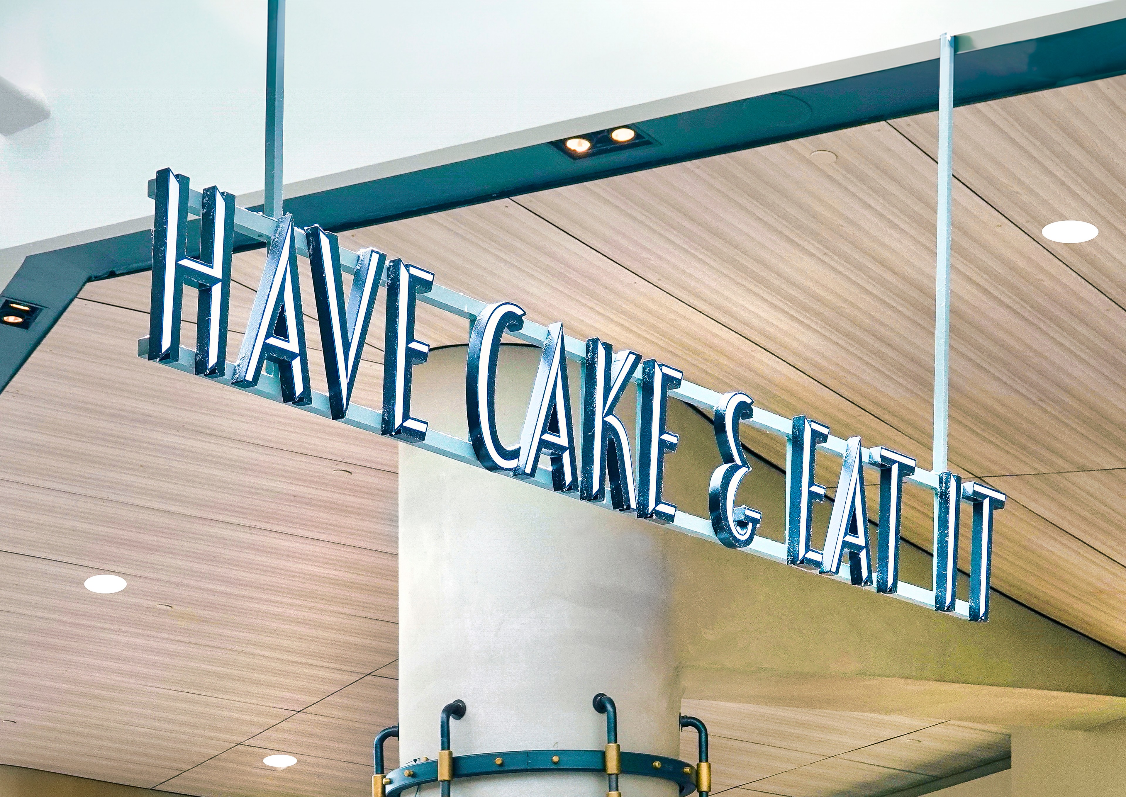 Paris-based artist Claire Fontaine’s work is a collection of neon, video, sculpture, painting, and text that often represents her political viewpoints and existential thoughts. She leans into her freshness and youth to represent her search for subjective emancipation. Fontaine’s whimsical sign reading Have Cake & Eat It suitably hangs in Aventura Mall’s Treats Food Hall, reminding visitors they can have it all.