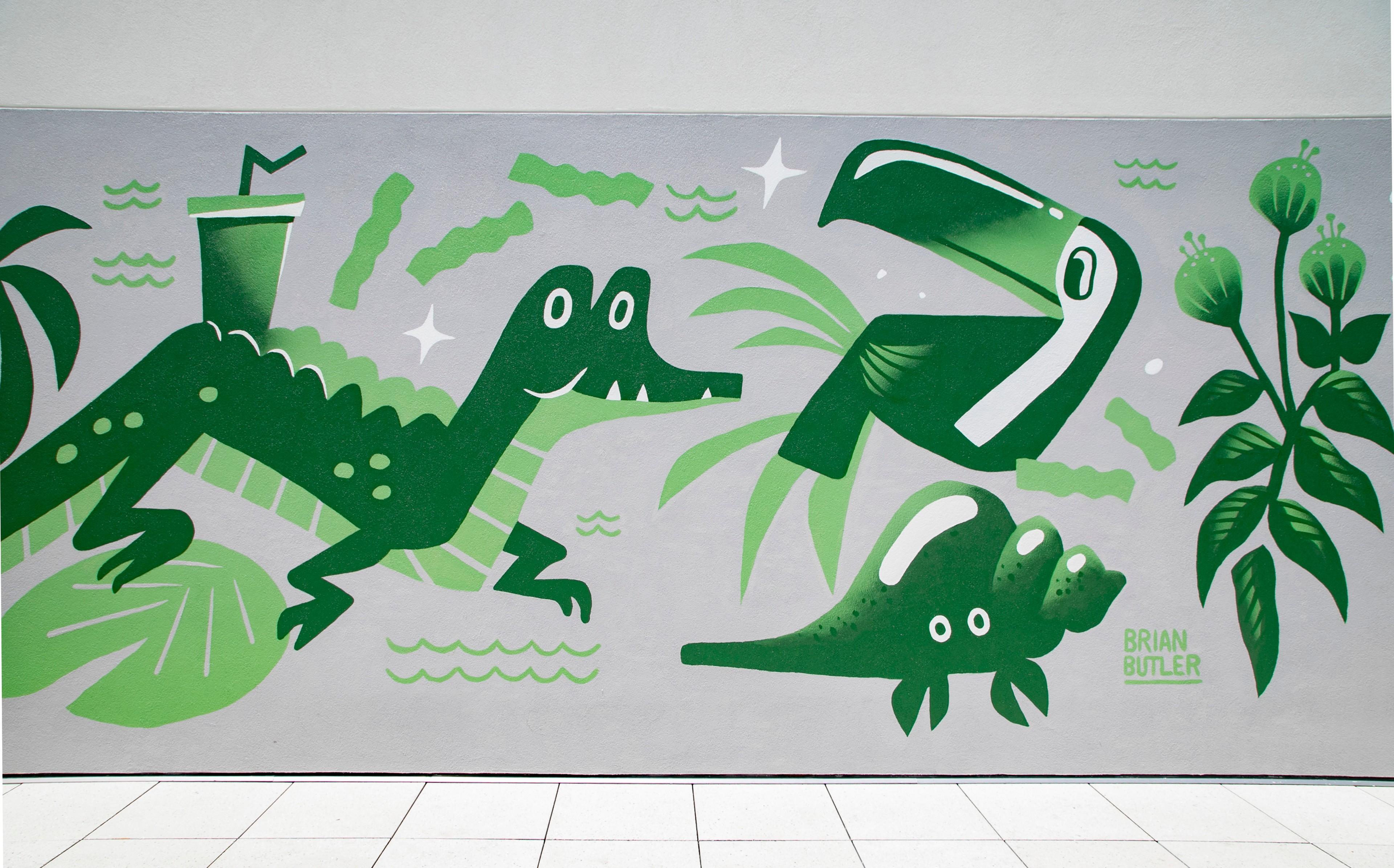Brian Butler takes local cues and reimagines them in a new and modern context. Paradise and Fries is a lighthearted play on Florida’s wild tropical climate, positioned in the immediate context of a food hall. Flamingos flex for cheeseburgers, while a gator balances a frosty shake. In this piece, flora and fauna are served with a side of fries.