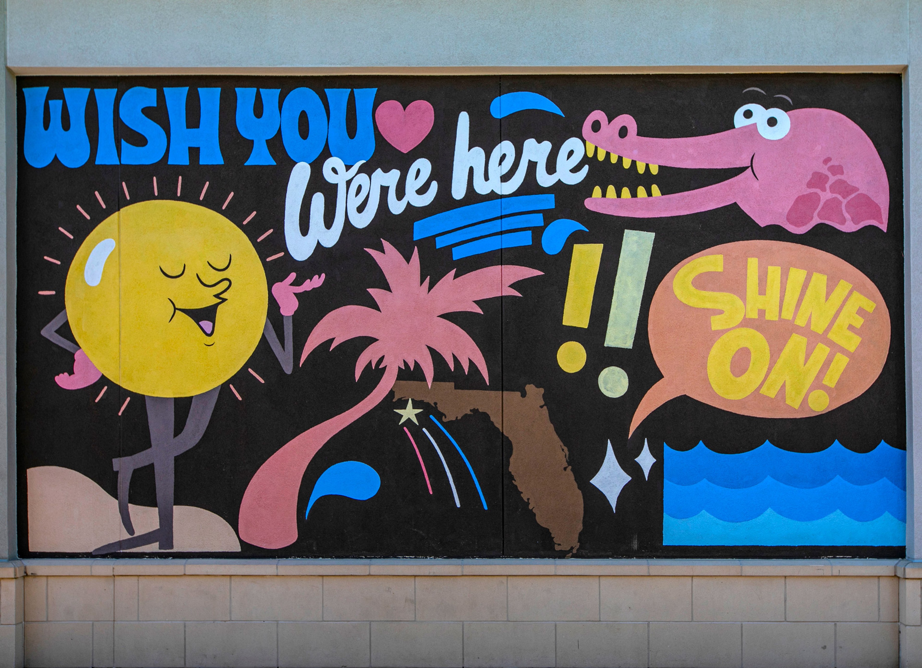 Created by the Australian husband-and-wife visual artists, DABSMYLA, Wish You Were Here is one of four murals by the artists at Destin Commons. With an established framework and unspoken set of rules – strengthened by over a decade of working together simultaneously – their singular goal is to tell an expansive story that is wholly unique to their own experiences in their work. They do just that with this mural.